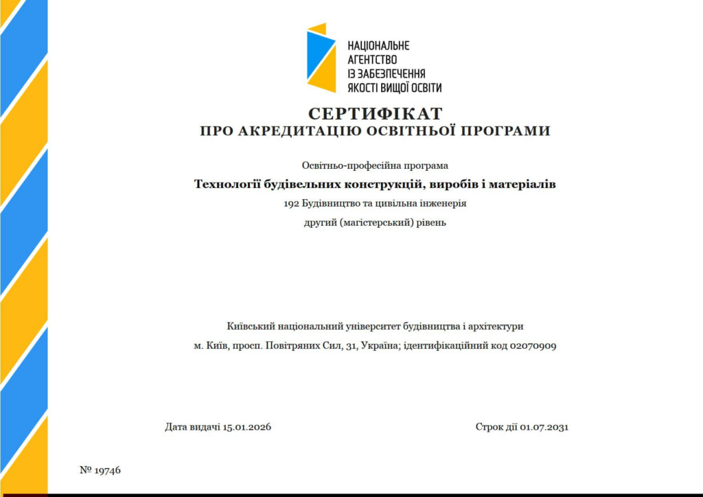 За результатами акредитаційних процедур успішно підтверджено якість ОПП “Технології будівельних конструкцій, виробів і матеріалів” за спеціальністю 192 “Будівництво та цивільна інженерія”.